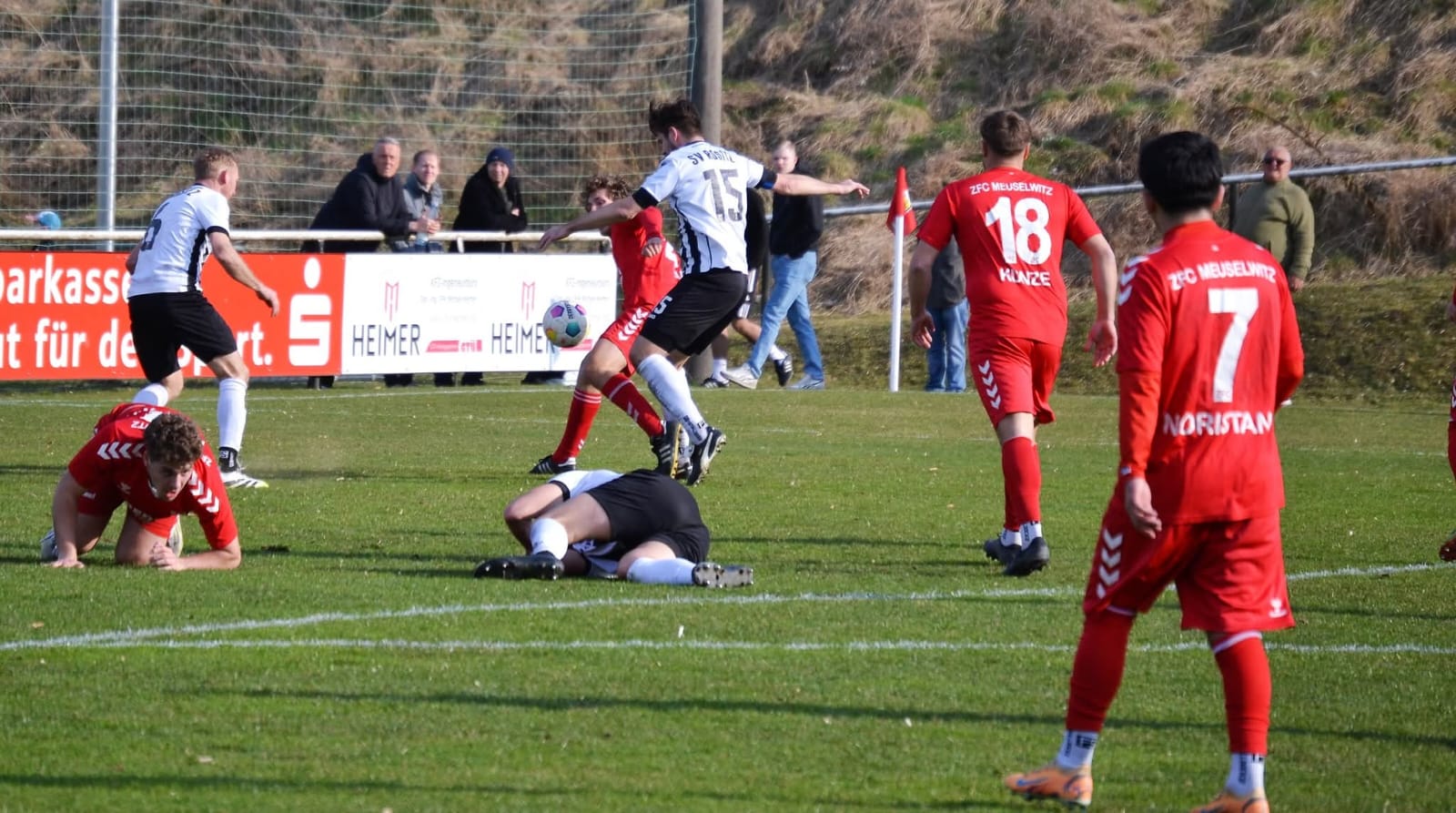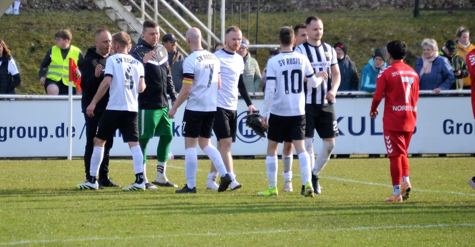 Dann zwei Aufreger in der anderen Hälfte. Erst vertauscht der Linienrichter passives und aktives Abseits und verhindert damit einen Alleingang von Sven Wilhelm Rentzsch auf dem Meuselwitzer Kasten, dann wird Maik Wegner klar im Gästestrafraum gefoult, auch hier hatte der Linienrichter klare Sicht. Sehr unglücklich aus Rositzer Sicht. Ansonsten hatte zumindest Hauptschiedsrichter Kropfelder die Partie jederzeit im Griff. Auch eine Rudelbildung zwischen Kevin Vogel und Mohamed moderierte er souverän und gab beiden berechtigterweise die gelbe Karte. Leider wurden die nun schwindenden Kräfte und das dadurch zunehmend schwächelnde Zweikampfverhalten in der Nachspielzeit zum Rositzer Verhängnis. Der lange Flankenball und die beiden folgenden Kopfbälle im Strafraum der Gastgeber wurden nicht entscheidend genug gestört, so dass die Gäste doch noch den umjubelnden Siegtreffer erzielen konnten. Kurze Zeit später hatte Maik Wegner noch die Chance zum Ausgleich. Daneben. Schlusspfiff. Niederlage. Ärgerlich.